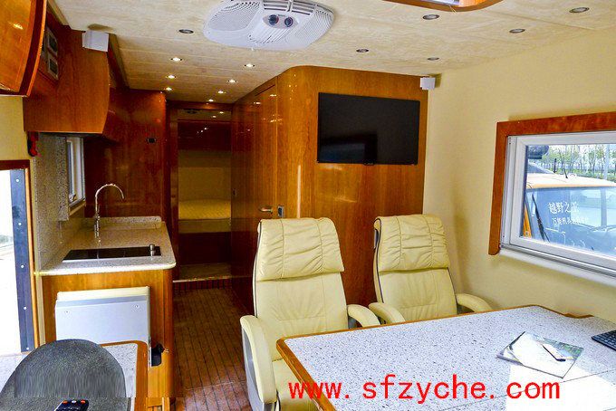 六驅(qū)越野房車(chē)車(chē)身內(nèi)整體豪華配置:在駕駛室中還有主流卡車(chē)中配備的天窗通風(fēng)系統(tǒng)和后排折疊床板,這款越野房車(chē)的后排內(nèi)部具有地板加熱系統(tǒng),獨(dú)立的會(huì)客廳,高級(jí)絨布真皮座椅具備多項(xiàng)可調(diào)功能,雖然包裹感不是很強(qiáng),但卻有一定的支撐性,更加符合越野房車(chē)的特質(zhì)。此外,中央空調(diào)、天窗與側(cè)窗外加頂部迎賓燈的點(diǎn)綴是恰到好處,前后對(duì)著的兩臺(tái)大尺寸液晶電視方面中央四位乘客觀(guān)看。在門(mén)口的兩側(cè),分別是吧臺(tái)和迷你廚房,電磁爐、微波爐、冰箱應(yīng)有盡有。車(chē)門(mén)頂部設(shè)有整車(chē)電路控制面板,可通過(guò)開(kāi)關(guān)控制燈光、車(chē)門(mén)等等。干濕分離的衛(wèi)生間分別分布在客廳旁與臥室中,其中一間設(shè)有浴盆和真空馬桶,另一間則配有恒溫淋浴,走廊的盡頭就是這間臥室,其擁有電控臥室門(mén),獨(dú)立中央空調(diào)、屋內(nèi)整體照明系統(tǒng)與液晶電視,此外整間臥室采用了實(shí)木裝潢,超寬的雙人床鋪?zhàn)銐蜍?chē)主享用。