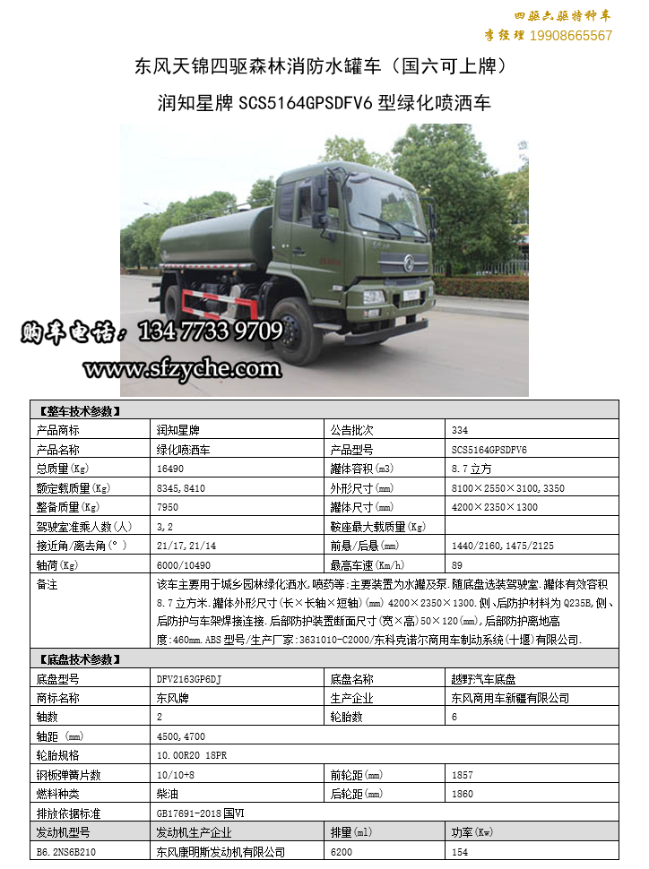 新聞中心東風天錦四驅森林消防灑水車_國六排放潤知星牌SCS5164GPSDFV6型四驅越野綠化噴灑車采用DFV2163GP6DJ型國六排放東風天錦四驅越野底盤,東風天錦D530一排半駕駛室,4×4驅動,康明斯B6.2NS6B210國六發(fā)動機210馬力,最大扭矩850N.m/1100-1700rpm,排量6.2L、韶齒手動六檔變速箱,東風德納車橋,前驅動橋4.5噸,后橋10噸,10.00R20輪胎,軸距4500mm/4700mm,電動玻璃,方向助力,斷氣剎,ABS,大燈自動調節(jié),自動調整臂,選裝原廠空調。罐體采用優(yōu)質碳鋼Q235板材,板材厚度4mm,罐體容積8.7立方,安裝夾心取力器,后置泵箱,消防栓接口左右各一個,消防炮采用PS30-50D消防水炮,流量40L/S/1.0MPa 水射程:≥50m,消防泵采用常壓消防泵型號:CB10/40車用消防泵,流量:40L/s,壓力:1.0MPa,駕駛室頂部安裝長條警燈帶喊話器,兩側噴涂白色森林消防字樣。