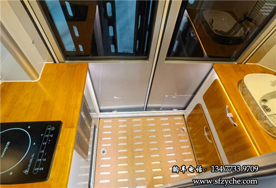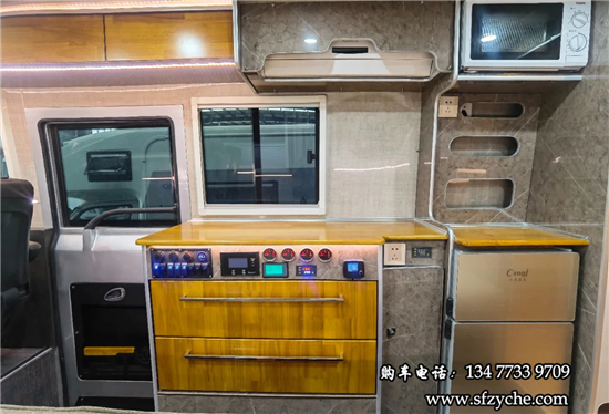 得益于方正的車身,車內(nèi)空間非常寬敞,內(nèi)寬可達(dá)2米。布局方面從前往后依次是駕駛區(qū)、乘坐區(qū)、生活區(qū)和尾部的廚衛(wèi)區(qū)域。整車核載5人,車廂中部采用2+1座椅布局,全部帶有扶手和頭枕,乘客座椅全部朝前設(shè)計(jì),增加了乘坐的舒適度。