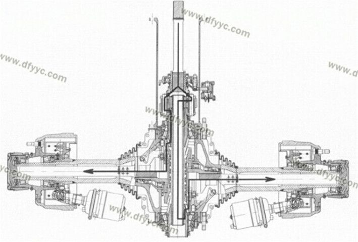另外,這種斷開式車橋的輪間差速器并不在橋包中,而是被轉(zhuǎn)移到了脊柱套管了,左右側(cè)車輪分別由兩套錐齒輪驅(qū)動(dòng),為了讓這兩套錐齒輪互不干涉,其左右半軸在縱向錯(cuò)開了一定的距離,也就是說它的兩個(gè)半軸并不在一個(gè)平面內(nèi)。類似的設(shè)計(jì)手法裝載機(jī)(4X4軸轉(zhuǎn)向的裝載機(jī))上也有使用,還有采用錯(cuò)開一定角度的做法來避免左右錐齒輪互相干涉的情況。