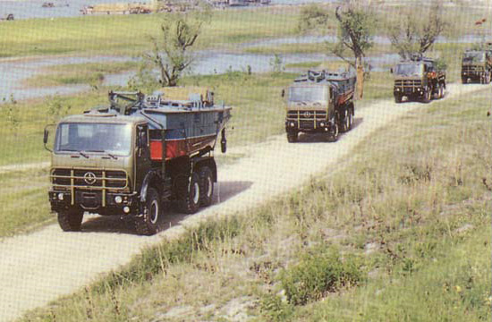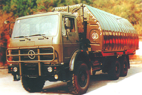 鐵馬XC2200重載卡車在1980年后期進(jìn)入PLA服役,主要用于運(yùn)輸重型工程設(shè)備和武器系統(tǒng)。中國鐵馬(Tiema) XC2200重載卡車由西南汽車廠(現(xiàn)在北方- 奔馳卡車公司分部)制造,位于重慶(Chongqing)市。卡車以德國梅賽德斯-奔馳2060型卡車為基礎(chǔ)。目前卡車在PLA服役中,被當(dāng)做重型工程設(shè)備卡車和武器系統(tǒng)車底盤。PLA在1970年后期訂購了少量的德國梅賽德斯-奔馳2026型重載卡車(8噸的容量,6X6)補(bǔ)充它不足的重載卡車。這些卡車主要地用于重型火炮拖車任務(wù)。PLA對(duì)車輛的性能印象深刻,并且接洽梅賽德斯- 奔馳公司去得到許可在中國聯(lián)合生產(chǎn)卡車。鐵馬XC2200(最初即是TM-SC2030)的發(fā)展,梅賽德斯- 奔馳2060型的一個(gè)中國仿造型,從1980年早期開始。 西南汽車廠,一個(gè)中國北方工業(yè)總公司(NORINCO)位于重慶(Chongqing)市的下屬公司,被選擇當(dāng)做主承包商。1982年看到了原型的介紹。稍后在1985年中國從西德引進(jìn)了ZF機(jī)械變速箱和KHD413風(fēng)冷柴油發(fā)動(dòng)機(jī)技術(shù),兩者在鐵馬XC2200卡車上被采用。XC2200批量生產(chǎn)在1986年開始,每年從生產(chǎn)線上生產(chǎn)2,000輛。大多數(shù)的這些車輛被PLA接收用于重貨物/設(shè)備運(yùn)輸、火炮拖車和武器系統(tǒng)車底盤。車輛包括在西藏高地、戈壁沙漠和中國最惡劣的道路和天氣狀況區(qū)域展示了優(yōu)良性能和可靠性。除了被PLA部署,車輛也被輸出到巴基斯坦、泰國、印尼和斯里蘭卡。XC2200采用雙車門正向控制駕駛室,位于發(fā)動(dòng)機(jī)艙上面。駕駛室有四個(gè)座位和在頂板有一個(gè)天窗。后面的貨物車身的后擋板和側(cè)擋板可放下,可拆卸蓬架和帆布蓬。單預(yù)備輪被垂直地安裝在乘員室后面,靠近載貨車箱在駕駛室和后貨物車體之間。這一個(gè)空間能用來容納一個(gè)修理工具箱和其它的裝載/卸貨設(shè)備。與第一代中國自行生產(chǎn)的重型臺(tái)車相比較,XC2200有好很多的通用性能,連同85公里/小時(shí)的最大道路速度和一個(gè)8噸的越野裝載能力。ZF5S-110/111 GPA變速箱有九個(gè)前進(jìn)檔和一個(gè)倒車檔。三個(gè)車軸和六個(gè)車輪全部運(yùn)行使用速度差速器鎖定裝置,即使當(dāng)車輛的一側(cè)上一個(gè)或更多的車輪沒有與地面接觸中,或已經(jīng)失去牽引,確保車輛持續(xù)驅(qū)動(dòng)。除了基本的貨物卡車改型之外,XC2200也可得到許多其它的改型, 包括4X4、8X8、長軸距貨車、起重機(jī)、掩護(hù)所、架橋車、運(yùn)船車、道路鋪設(shè)車和多種武器系統(tǒng)車底盤。中國也已經(jīng)發(fā)展基于XC2200設(shè)計(jì)的WZ551輪式裝甲人員輸送車(APC)。鐵馬XC2200浮橋架橋卡車。鐵馬XC2200用于WS-1多管火箭發(fā)射裝置車底盤。鐵馬XC2200用于運(yùn)船車。