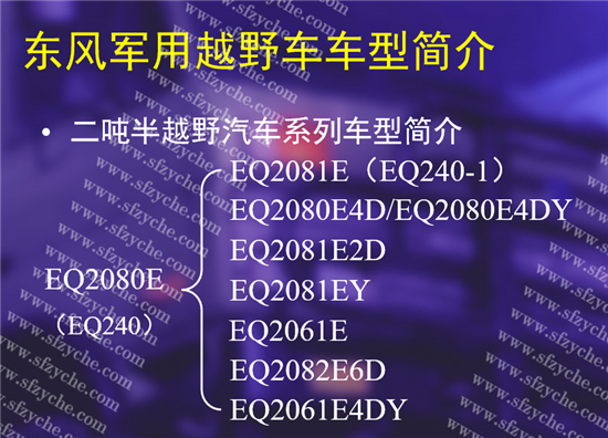 EQ240六驅(qū)2.5噸軍車型號(hào)和代碼有(70-80年代的EQ240汽油車、90年代的EQ2081E汽油車和2000年以后的EQ2082E6D柴油車型),EQ240換代的三款車型配件通用率基本相同,不同的區(qū)別主要是發(fā)動(dòng)機(jī)、方向機(jī)、分動(dòng)箱、傳動(dòng)軸的凸緣叉接頭、主減速器速比6:35和6:37兩種,老款汽油車型都是6:37齒盆角齒;后期柴油車采用6:35齒盆角齒等。