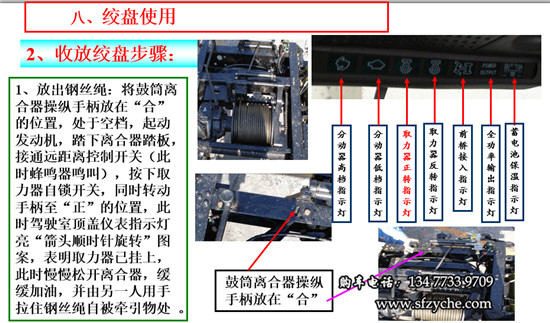 2、收鋼絲繩:拉上駐車制動(dòng)受控閥,并用木塊,石頭掩住車輪,將鼓筒離合器操縱機(jī)構(gòu)手柄放在“合”的位置,變速器處于空檔 ,起動(dòng)發(fā)動(dòng)機(jī),踏下離合器踏板,接通遠(yuǎn)距離控制開關(guān)(此時(shí)蜂鳴器叫),按下取力器自鎖開關(guān),同時(shí)轉(zhuǎn)動(dòng)手柄至“反”的位置,此時(shí)駕駛室頂蓋儀表指示燈亮“箭頭逆時(shí)針旋轉(zhuǎn)”圖案,表明取力器已掛上,此時(shí)慢慢松開離合器,平穩(wěn)加油,即可收卷鋼絲繩,開始牽引。牽引完后,踩下離合器踏板,按下取力器自鎖開關(guān),同時(shí)轉(zhuǎn)動(dòng)手柄至“0”的位置,將鼓筒離合器操縱手柄放在“離”的位置,關(guān)閉遠(yuǎn)距離控制開關(guān)。