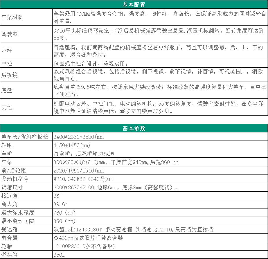 東風(fēng)大力神KC六驅(qū)自卸車配置參數(shù):DFL3251KC型六驅(qū)大力神自卸車,采用天龍大力神KC駕駛室,三段式保險(xiǎn)杠,液壓翻轉(zhuǎn),帶原廠空調(diào),濰柴國(guó)三WP12.340型340馬力發(fā)動(dòng)機(jī),法士特十二檔變速箱,軸距4500+1400mm,株齒分動(dòng)箱,北奔9噸前驅(qū)動(dòng)橋,選裝13/16噸輪減中后橋,輪減、差速鎖,大梁300mm自卸專用梁,輪胎12.00R20鋼絲胎10+1條,5.6米-6米自卸貨箱,車廂采用邊10底12mm鋼板,加裝淋水器。
